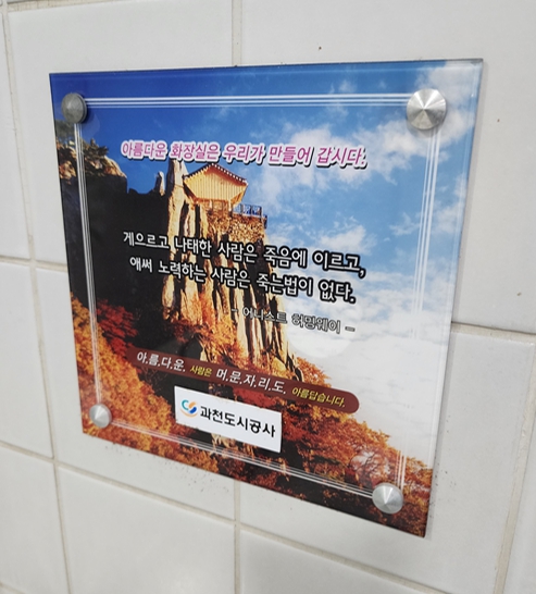 안녕하세요, 과천시민회관 지하2층 빙상장 출입구쪽 남자화장실 세면대에 위치한 첨부파일의 명언의 저자가 잘못 기재되어 바로 잡을것을 요청 드립니다. 게으르고 나태한 사람은 죽음에 이르고, 애써 노력하는 사람은 죽는법이 없다 는 "어니스트 허밍웨이"의 명언이 아닌 "법구경"의 말씀 입니다. 사소하지만 변경 해주시면 감사드리겠습니다.