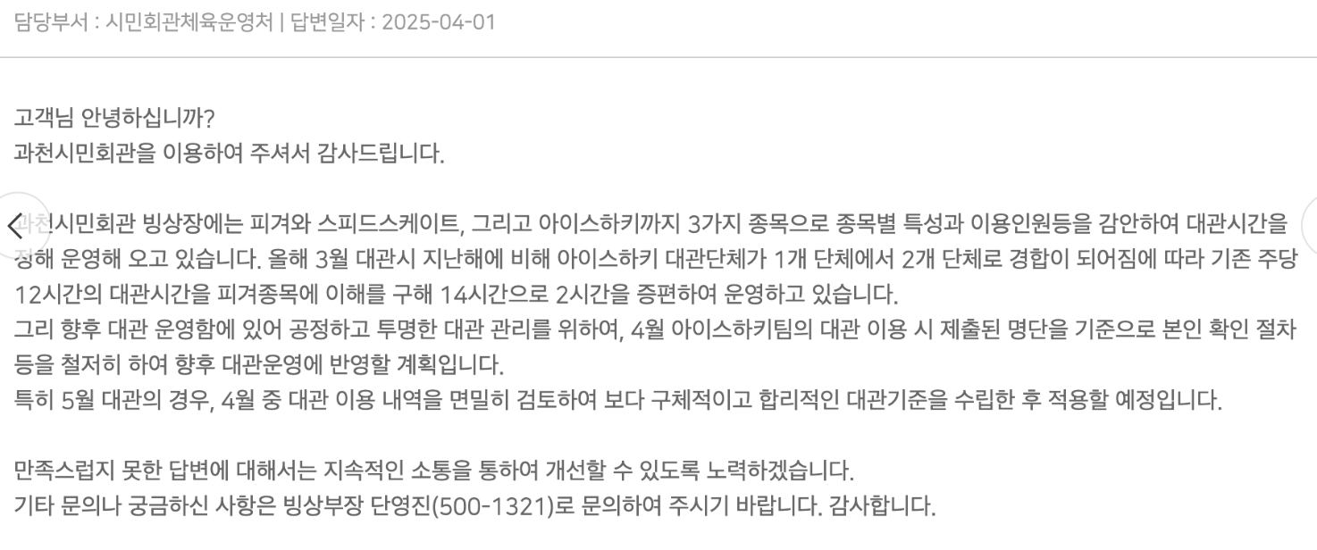 과천시 시민회관 빙상장 대관 이슈 관련해, 과천도시공사 측의 소극 행정에 대한 개선을 요구하며, 허위등록자에 대한 과천시민회관 프로그램 전체 이용 제한을 조치해주시기 바랍니다. 실제 이용 인원 수를 허위로 등록해, 관내 인원 비율을 높인 이후, 엘리트를 지망하는 관내 유소년들의 훈련 시간을 빼앗고자 하는 일부 학부모가 관내에 있는 것으로 알고 있습니다. 친분 있는 지인들의 정보를 활용해, 허수로 등록된 인원까지 포함해 약 100명 가까운 인원으로 대관신청을 한 이후, 실제로는 10~14명 내외의 인원으로 빙상장을 개인적인 목적으로 이용하게 하는 사례가 밝혀졌음에도 이에 대한 합당한 조치를 취하지 않고, 오히려 이러한 허수 등록을 계속해서 방관하고 방조하는 과천도시공사의 소극적 행정에 대한 답을 요구합니다. 개인의 어긋난 욕심에서 비롯한 부정하고 부당한 방식이 결코 정의가 될 수 없음을 명확히 하여, 이러한 사례가 악용되어 재발하지 않게끔 과천시의 선량한 시민들이 피해보는 일이 이뤄지지 않게끔 조치 부탁드립니다. 답변주신 내용처럼, 이후 대관에 문제 없도록 진행될 수 있게, 마지막으로 정중히 요청드리겠습니다.