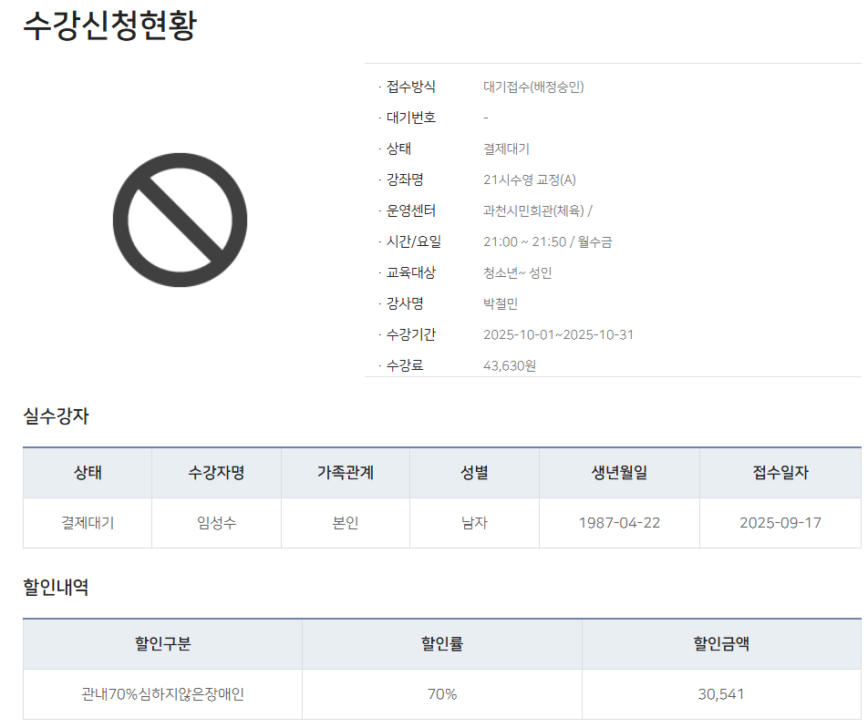 참고로 10월은 휴관으로 인해(10월 마지막주 월요일 시설점검일) 1일 감액한 금액 43,630원이고 할인 적용후 금액은 13,080원 입니다.