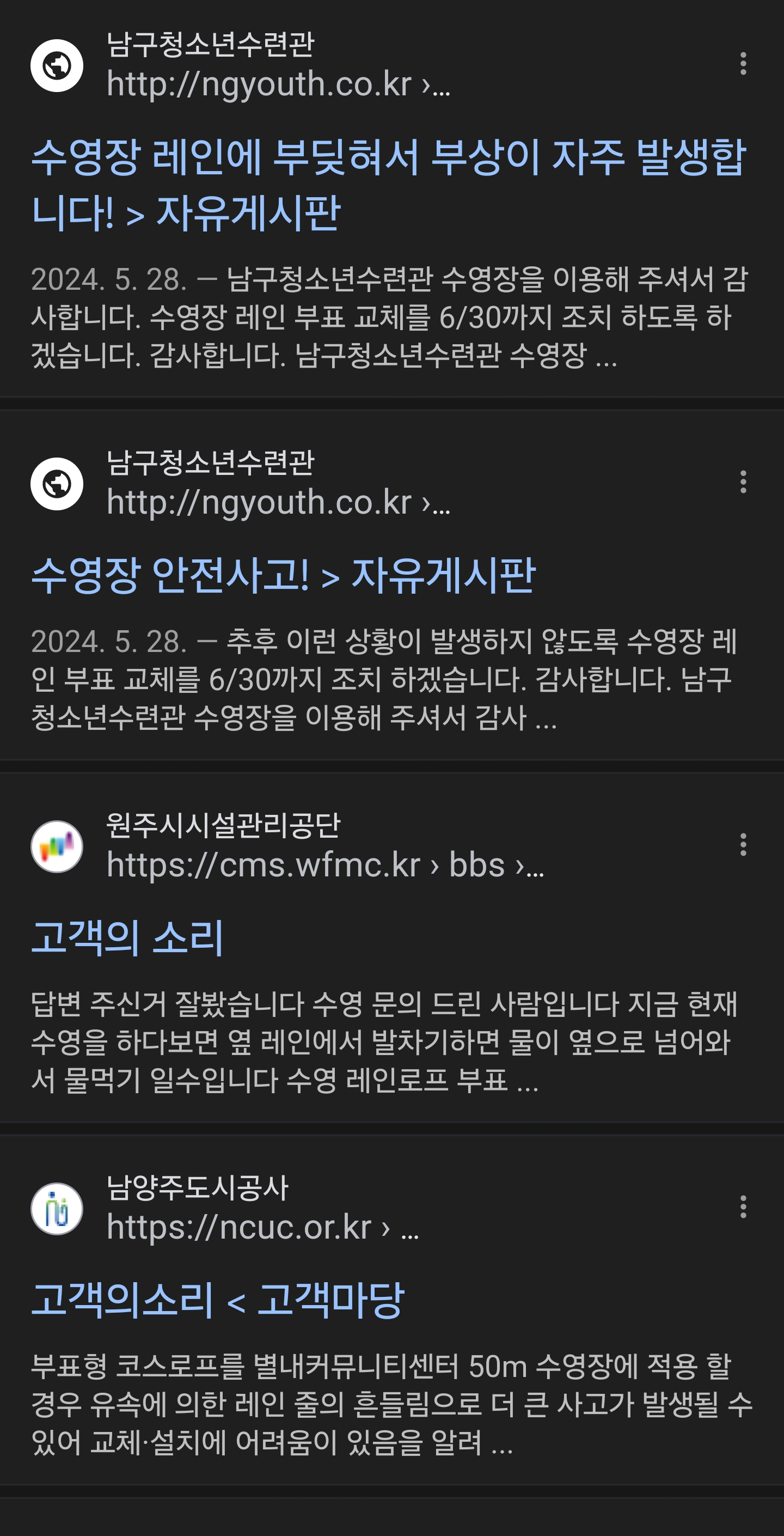 수고많으십니다 수영을 20년 넘게 하는데, 수영장 레인 부표(수레바퀴 모양의 모서리)에 부딪혀서 엄지 손가락 타박상과 피부가 벗겨져서 피가 났습니다. 여러 수영 회원님들이 계속 다치고 있습니다. 1. 레인 안전부표(원기둥형 등 부딪힐때 덜 다치는 모양)로 교체 요청드립니다.(교체는 즉시 또는 내년 수영장 공사 예정시 희망) 2. 혹시 저는 실비 보험이 있지만, 수영하다가 다치면 도시공사가 가입한 보험 유무와 보상 방법 문의합니다. 감사합니다. (참고로 인터넷에 있는 수영장 레인부표 사고사례는 첨부합니다.)