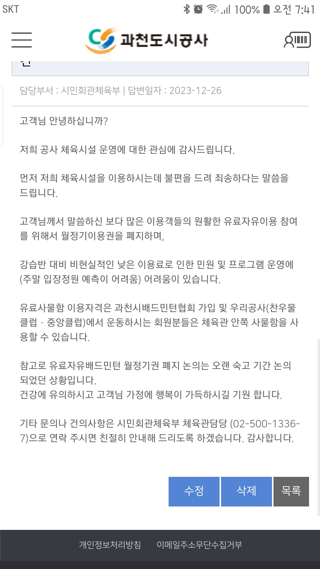 저희 공사 체육시설을 이용해 주셔서 감사합니다.