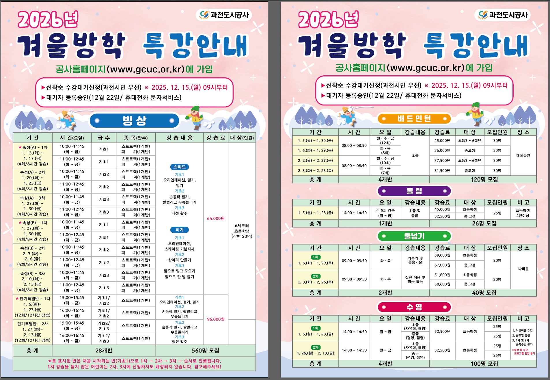 빙상, 볼링, 수영, 배드민턴, 줄넘기로 신나는 겨울방학을 계획해 보세요!