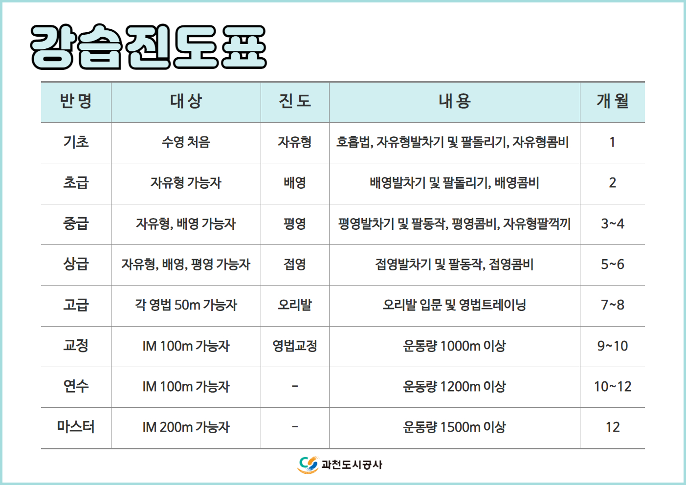 2024년 과천시민회관 수영장 강습진도표 안내
