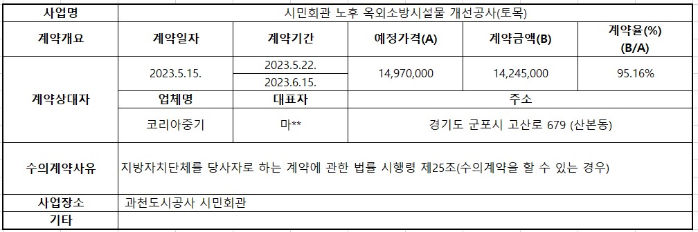 2023년 5월 수의계약 내역공개(시민회관 노후 옥외소방시설물 개선공사(토목))