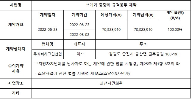 2022년 6월 수의계약 내역 공개(쓰레기 종량제 규격봉투 제작)