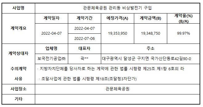 2022년 4월 수의계약 내역 공개(관문체육공원 관리동 비상발전기 구입)