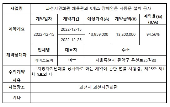 2022년 12월 수의계약 내역 공개(과천시민회관 체육관외 3개소 장애인용 자동문 설치 공사)