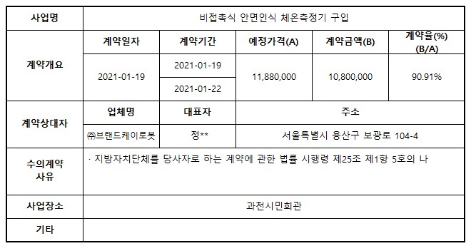 2021년 1월 수의계약 내역 공개(비접촉식 안면인식 체온측정기 구입)