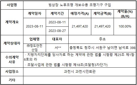 2023년 8월 수의계약 내역 공개(빙상장 노후조명 개보수용 조명기구 구입)