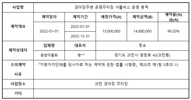 2022년 1월 수의계약 내역 공개(경마장주변 공영주차장 셔틀버스 운영 용역)
