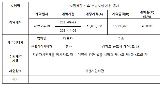 2021년 9월 수의계약 내역 공개(시민회관 노후 소방시설 개선 공사)