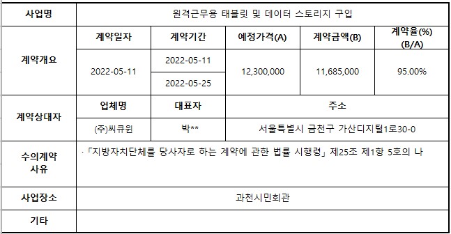 2022년 5월 수의계약 내역 공개(원격근무용 태블릿 및 데이터 스토리지 구입)