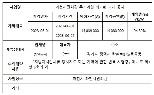 2023년 6월 수의계약 내역 공개(과천시민회관 주기계실 배기휀 교체 공사)