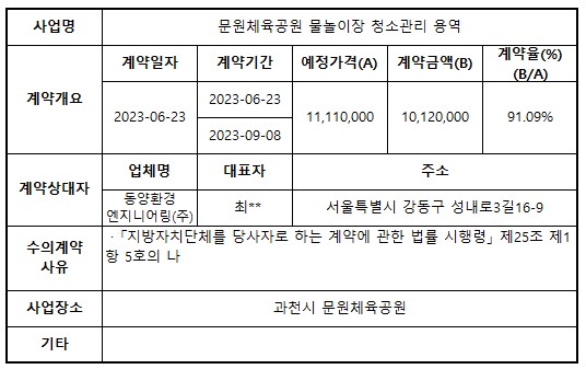 2023년 6월 수의계약 내역 공개(문원체육공원 물놀이장 청소관리 용역)