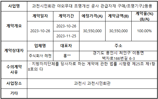 2023년 10월 수의계약 내역 공개(과천시민회관 야외무대 조명개선 공사 관급자재 구매(조명기구2등용))
