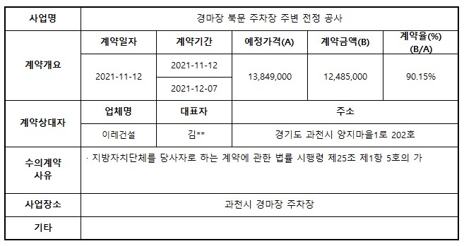2021년 11월 수의계약 내역 공개(경마장 북문 주차장 주변 전정 공사)