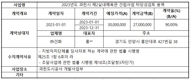 2023년 1월 수의계약 내역공개(2023년 과천시 제2실내체육관 건립사업 타당성 검토 용역)