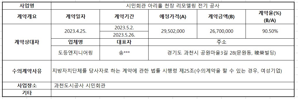 2023년 4월 수의계약 내역공개(시민회관 아리홀 천장 리모델링 전기 공사)