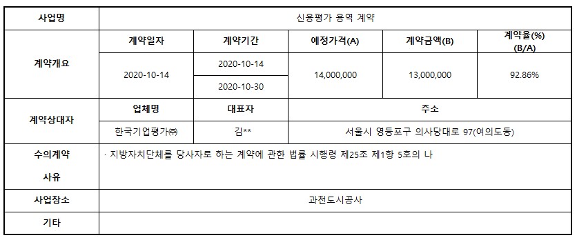 2020년 10월 수의계약 내역 공개(신용평가 용역 계약)