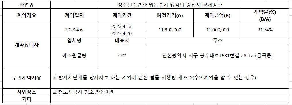 2023년 4월 수의계약 내역공개(청소년수련관 냉온수기 냉각탑 충진재 교체공사)