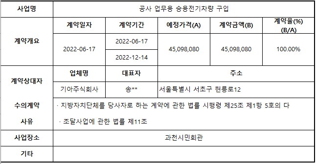 2022년 6월 수의계약 내역 공개(공사 업무용 승용전기차량 구입)
