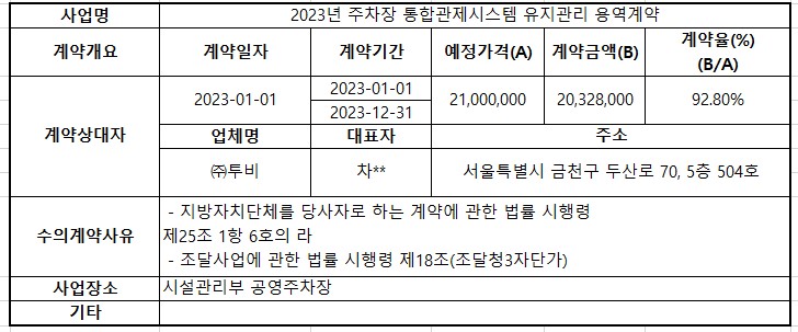 2023년 1월 수의계약 내역공개(2023년주차장 통합관제시스템 유지관리 용역계약)