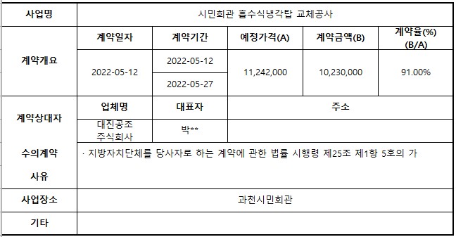 2022년 5월 수의계약 내역 공개(시민회관 흡수식냉각탑 교체공사)