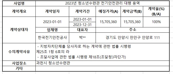 2023년 1월 수의계약 내역공개(2023년 청소년수련관 전기안전관리 대행 용역)