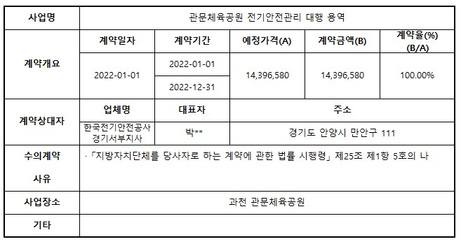 2022년 1월 수의계약 내역 공개(관문체육공원 전기안전관리 대행 용역)