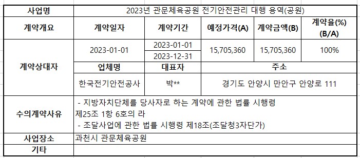 2023년 1월 수의계약 내역공개(2023년 관문체육공원 전기안전관리 대행 용역)