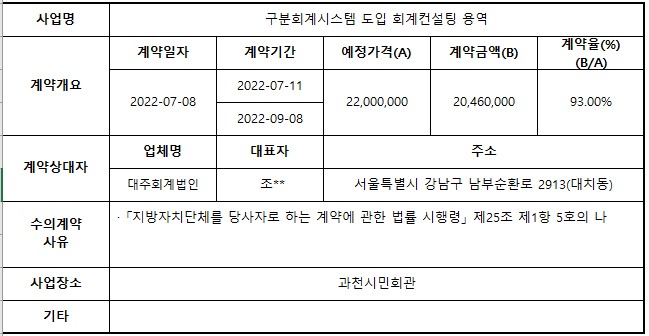 2022년 7월 수의계약 내역 공개(구분회계시스템 도입 회계컨설팅 용역)