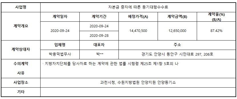 2020년 9월 수의계약 내역 공개(자본금 증자에 따른 등기대행수수료)