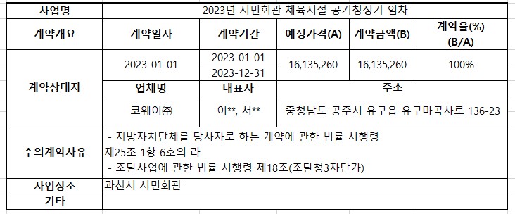2023년 1월 수의계약 내역공개(2023년 시민회관 체육시설 공기청정기 임차)