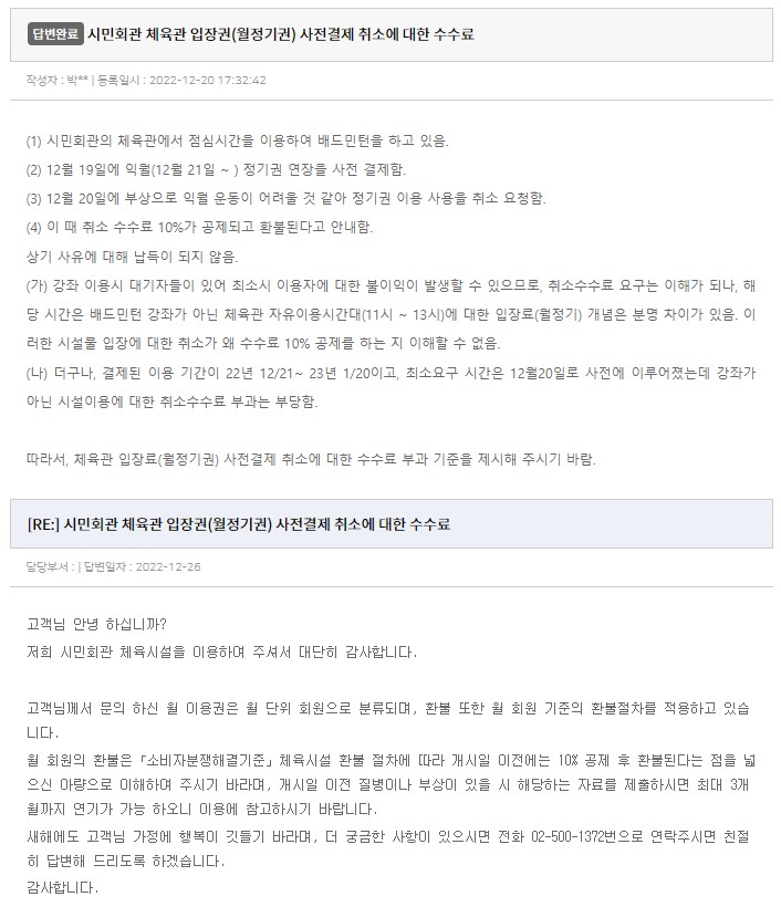 "~~ 월 이용권은 월단위 회원으로 분류되며, 환불 또한 월회원 기준의 환불절차를 적용~~~" 이라는 답변에서 (1) 일입장권의 경우, 바로 입장 취소 시 환불이 아닌 결제취소 개념으로 처리됨. (2) 똑같은 적용이라면, 월이용 개시 전(저의 경우 1일 전)에 충분히 "결제취소"로 처리됨이 타당할 것으로 보이는 데, 왜 그 환불개념으로 적용되는지 이해가 안됨. (3) 이전 글에서 제기하였듯, 수강강좌의 월회원일 경우 (예로 배드민턴도 오전강좌, 저녁강좌) 수강신청 인원제한이 있어 등록취소시에 페널티의 수수료 공제는 이해할 수 있으나, 저의 경우에는 11시~13시까지의 점심시간의 모두에게 허용된 인워제한없는 자유입장시간에 대해 등록갱신일이 정확하지 않아 3일전에 한달을 선결재하고, 이용 1일전에 바로 결재 취소를 요구한 것임. 월회원이라는 고정적 설명이 아니라 분명한 이용의 특성이 존재하는 데 이에 대한 구분이 없이 적용되는 기준은 분명히 부당하다고 생각됩니다. 누가 봐도 충분히 결재취소로 처리 가능한 것을 10%공제 되는 환불조치로 통보한 것은 납득할 수 없습니다. 해당 규정(절차)에 대한 제가 할 수 있는 이의신청 방법이 있다면 제시해 주시기 바랍니다.