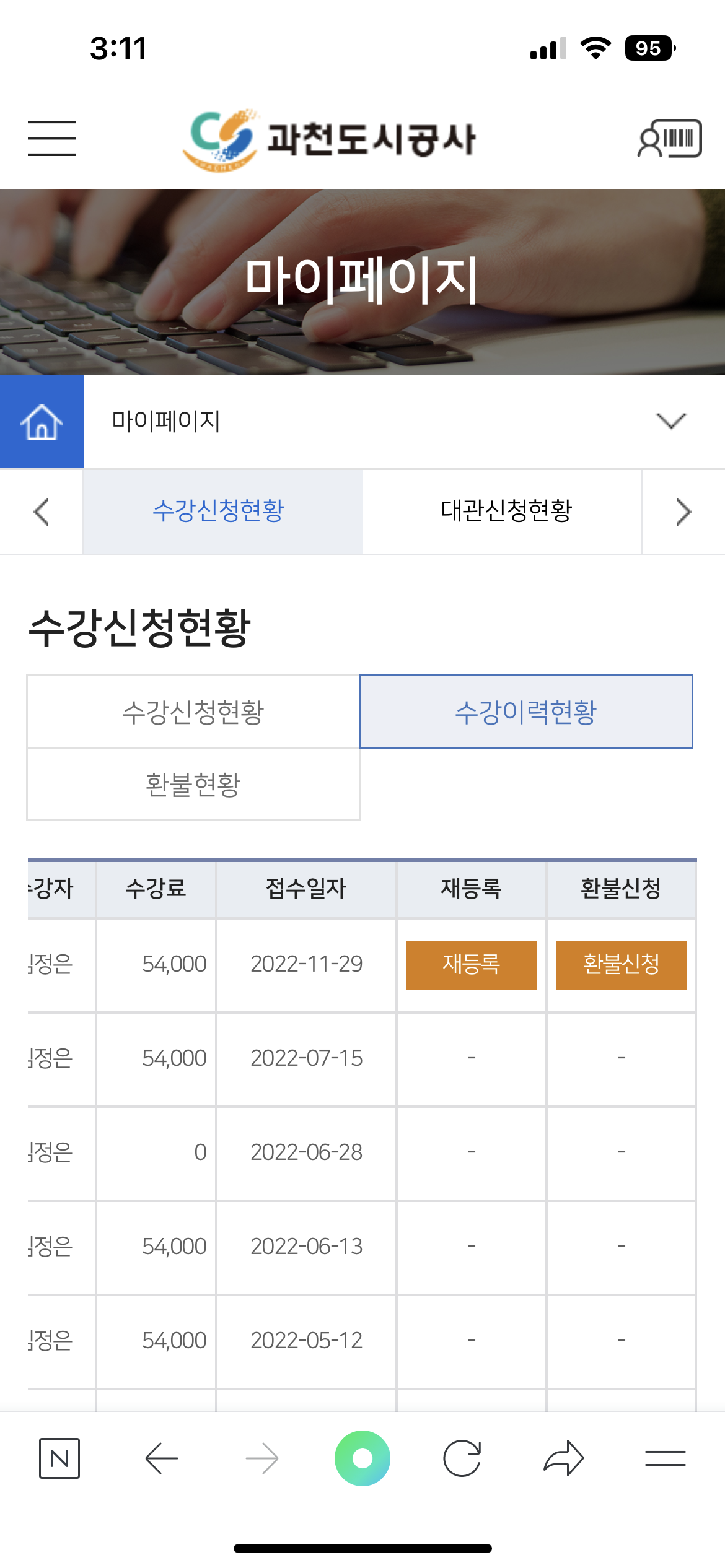 문의하신 재등록은 마이페이지 수강이력현황 재등록클릭(실수강자,수강기간 선택)->수강신청현황 결제하기클릭 순서로 결제를 진행하시면 됩니다.