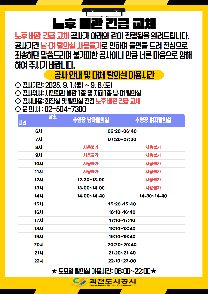 노후 배관 긴급 교체 공사에 따른 대체 탈의실 이용시간 안내