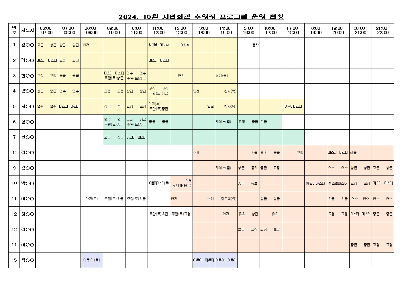 2024년 10월 과천시민회관 수영장 프로그램 운영현황표