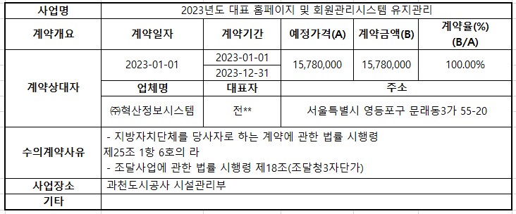 2023년 1월 수의계약 내역공개(2023년도 대표 홈페이지 및 회원관리시스템 유지관리)