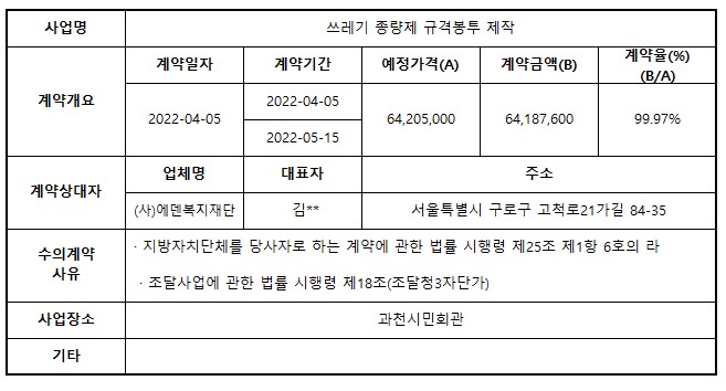 2022년 4월 수의계약 내역 공개(쓰레기 종량제 규격봉투 제작)