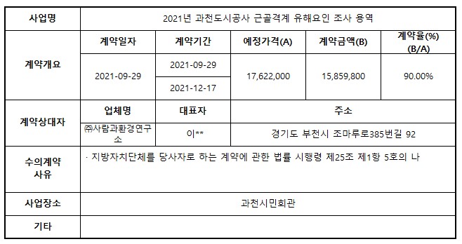 2021년 9월 수의계약 내역 공개(2021년 과천도시공사 근골격계 유해요인 조사 용역)