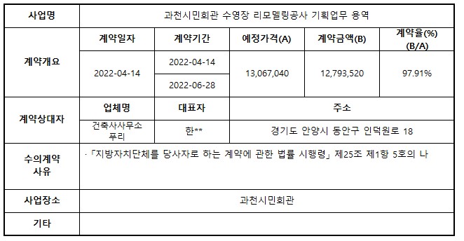2022년 4월 수의계약 내역 공개(과천시민회관 수영장 리모델링 공사 기획업무 용역)