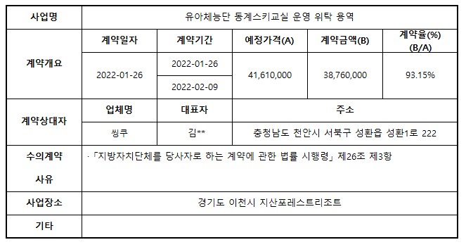 2022년 1월 수의계약 내역 공개(유아체능단 동계스키교실 운영 위탁 용역)