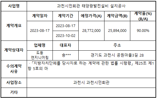 2023년 8월 수의계약 내역 공개(과천시민회관 태양광발전설비 설치공사)