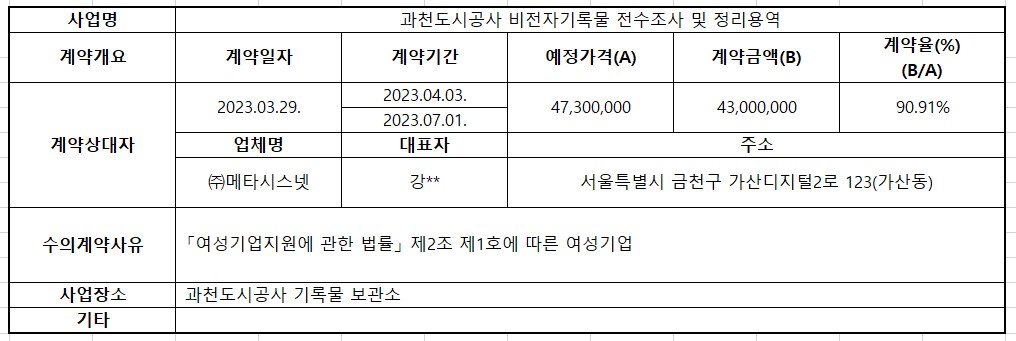 2023년 3월 수의계약 내역공개(과천도시공사 비전자기록물 전수조사 및 정리)