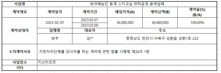 2023년 2월 수의계약 내역공개(유아체능단 동계 스키교실 위탁운영 용역업체)