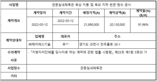 2022년 5월 수의계약 내역 공개(관문실내체육관 옥상 지붕 및 옥외 지하썬큰 방수 공사)