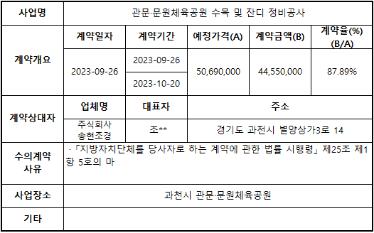 2023년 9월 수의계약 내역 공개(관문·문원체육공원 수목 및 잔디 정비공사)