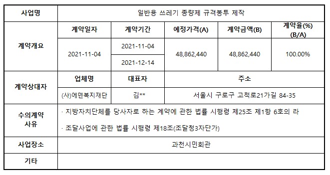 2021년 11월 수의계약 내역 공개(일반용 쓰레기 종량제 규격봉투 제작)