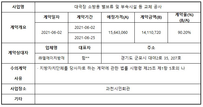 2021년 6월 수의계약 내역 공개(대극장 소방용 밸브류 및 부속시설 등 교체 공사)