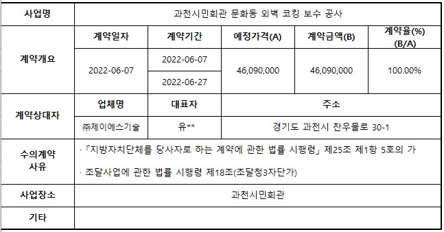 2022년 6월 수의계약 내역 공개(과천시민회관 문화동 외벽 코킹 보수 공사)